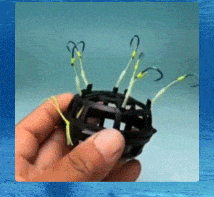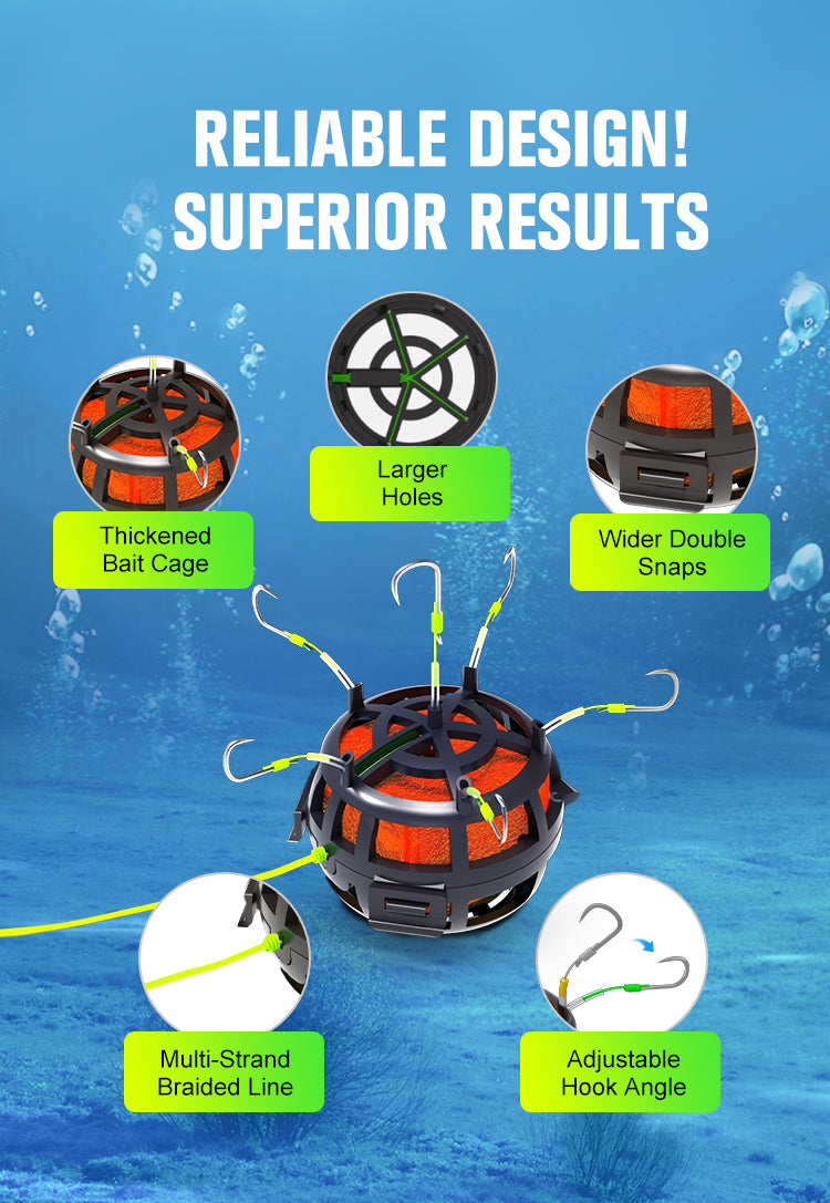 All-in-One-Ködersystem- Kombiniert 6 scharfe Haken mit einem geräumigen Köderkäfig, um Fische schneller anzulocken. Beladen Sie den Käfig mit Würfeln, Pellets oder Pulverködern - so entstehen unwiderstehliche Duftspuren, die das Fressen auslösen.
