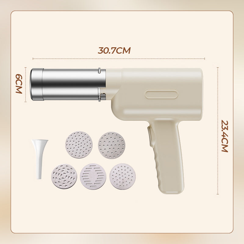 Lieferumfang: 1 × 5-in-1 elektrischer Handnudelhersteller, 1 × Ladekabel, 1 × Messbecher, 1 × Teigschaber