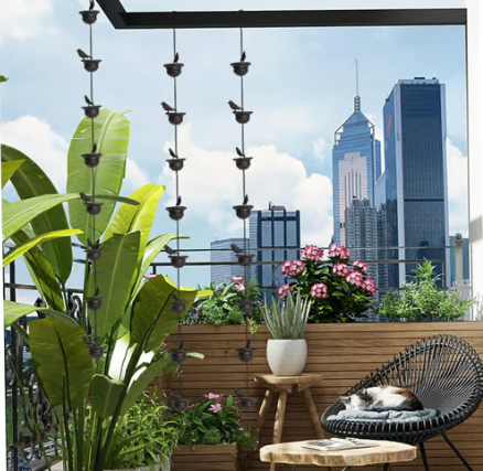 Diese kaskadenförmige Regenkette ist eine beeindruckende Alternative zu herkömmlichen Fallrohren. Regenwasser flieĂt sanft von einem Vogelbad zum nĂ€chsten und erzeugt einen natĂŒrlichen Wasserfalleffekt, der sowohl optisch als auch akustisch beruhigend wirkt.