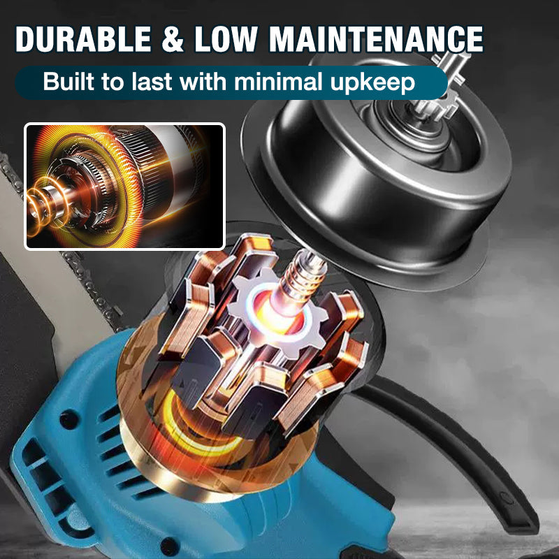 LANGLEBIG UND WARTUNGSARM – Mit Führungsschienen aus gehärtetem Wolframstahl und einem bürstenlosen Motor ist diese Kettensäge verschleißfest und hält 8–12 Jahre, ohne dass die Kohlebürsten ausgetauscht werden müssen, was den Wartungsaufwand reduziert.