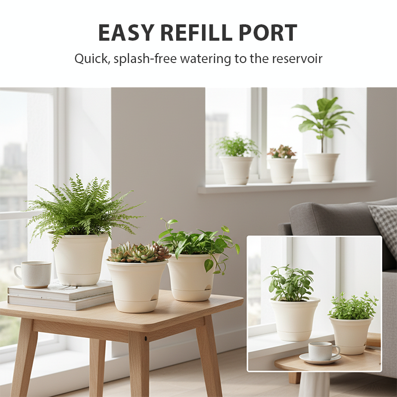 EINFACHE NACHFÜLLÖFFNUNG - Die praktische Nachfüllöffnung ermöglicht eine schnelle, spritzfreie Zugabe von Wasser direkt in das Reservoir. Dieses Design lässt die Erde und die Blätter unberührt und gewährleistet dennoch eine gleichmäßige Feuchtigkeitsverteilung. Einfach, sauber und praktisch – so wird die Pflanzenpflege einfacher und effizienter denn je.
