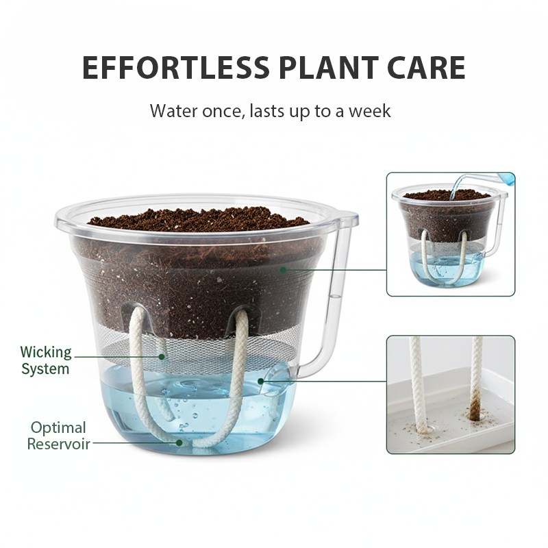 SICHTBARER WASSERSTAND - Der transluzente Außentopf zeigt den Wasserstand klar an, sodass Sie ihn auf einen Blick überprüfen können. Dieses durchdachte Merkmal nimmt Ihnen jedes Rätselraten ab, hilft Ihnen, rechtzeitig nachzufüllen und ein Überlaufen zu vermeiden. Es ist eine mühelose Möglichkeit, sicherzustellen, dass Ihre Pflanzen immer die richtige Wassermenge erhalten, was ein gleichmäßiges Wachstum und Frische unterstützt.